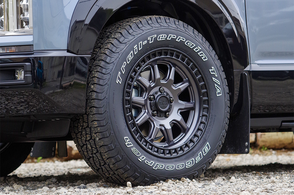 納車したばかりの三菱デリカD5後期に17インチ BLACKRHINO CALICO(MatteGunmetal w/MatteBlackLip)にBF Goodrich Trail-Terrain T/A 245/65R17をインナーフェンダー内を加工して装着です。ホイールカラーに合わせてバランスウエイト、エアバルブをブラックにしてナットはMcGardインストレーションKIT BLACKを使って取付けです。ホイールカラーも車体色と相性抜群。外径も出面もワイルドに仕上がりました。この度はご来店、ご購入ありがとうございました。ごぶやまパート2