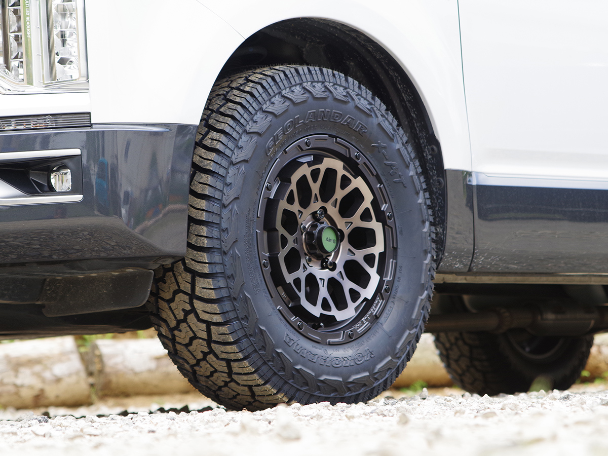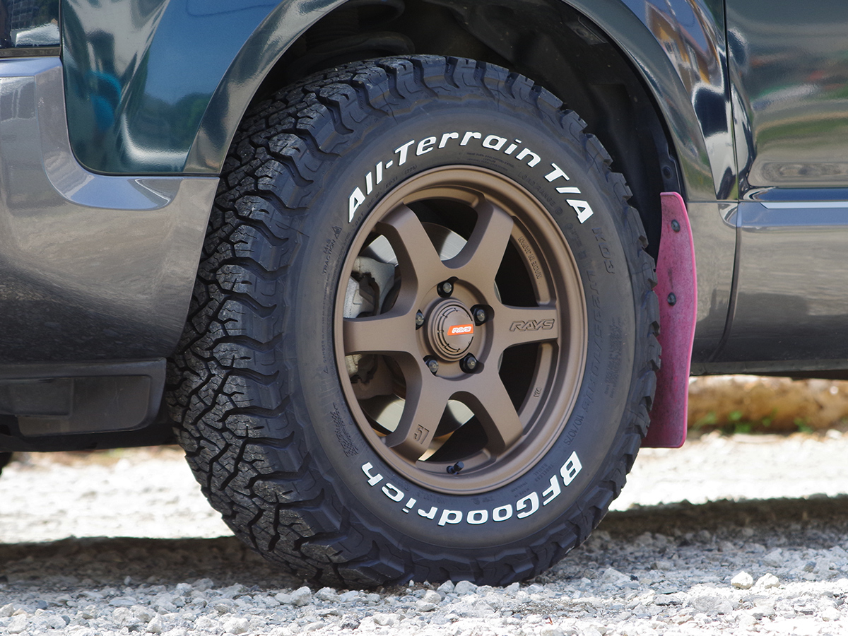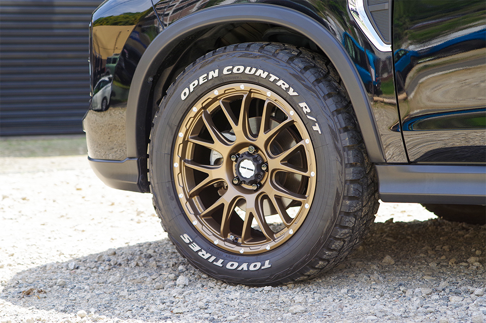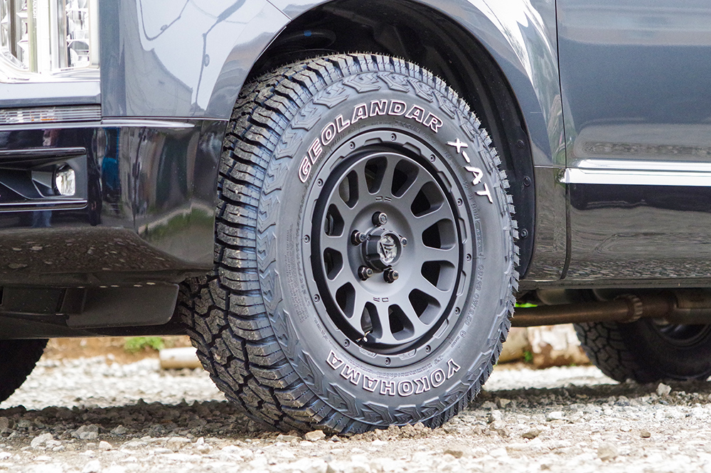 を入れて迫力ある出面に。ホイールカラーが車体色に合っていてブラックレターでもオフロード感ある良い感じの見た目と出面に仕上がりました。この度はご来店、ご購入ありがとうございました。ごぶやまパート2