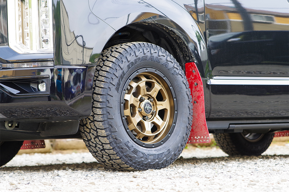 三菱デリカD5に16インチ NITROPOWER M7 PHALANX (MatteBronze/RimBlack)を装着です。タイヤはFALKEN WILDPEAK A/T3 W 235/70R16を組込みました。ホイールカラーに合わせてバランスウエイトをブラックにしてナットはMcGardインストレーションKIT BLACKを使って取付けです。出面は前後にGBSデリカD:5専用ハブ一体型スペーサー