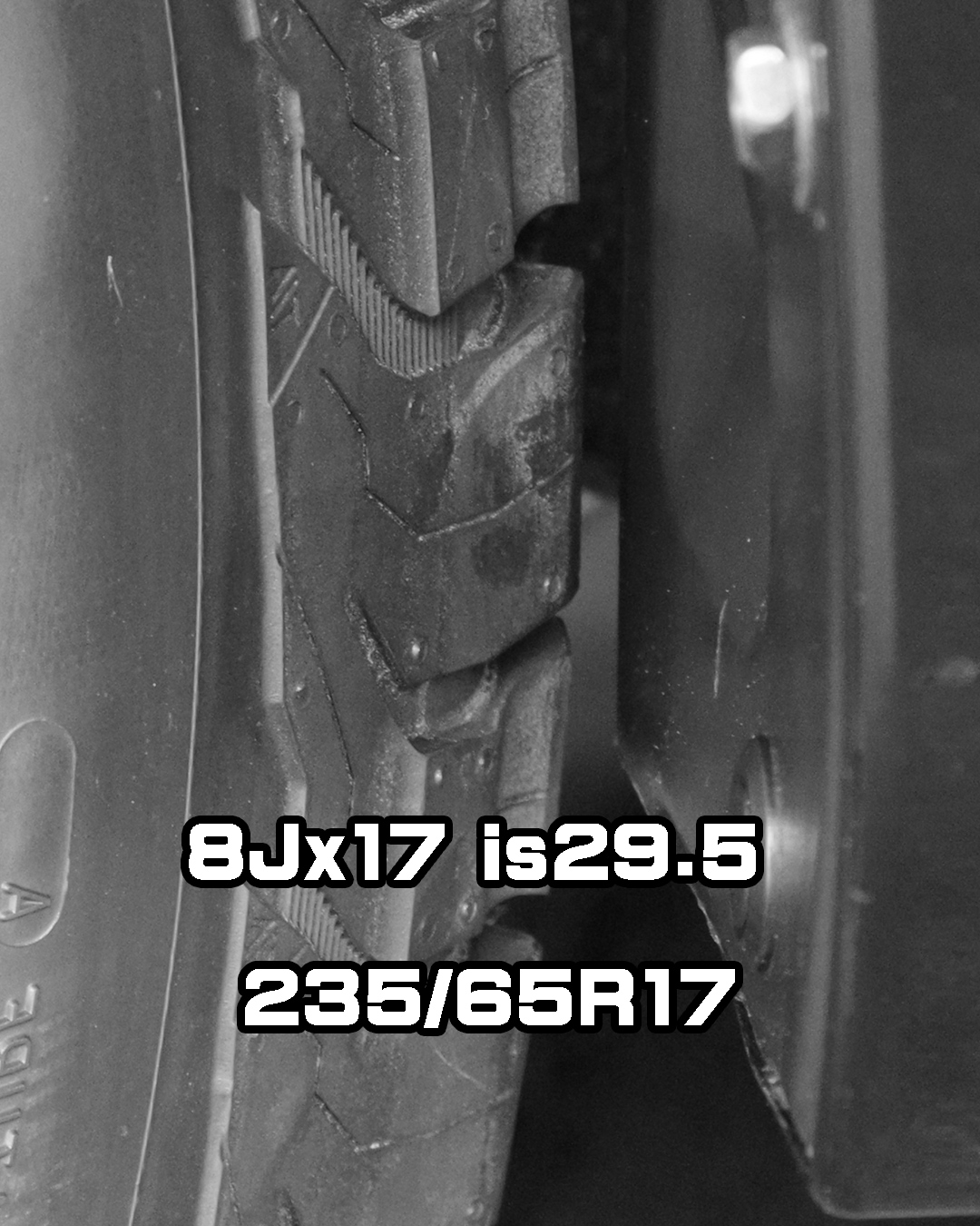 | 8Jx17 is29.5 235/65R17 径738mm インナーライナーとのクリアランスに 少し余裕があります 235/70R16もほぼ同じです |