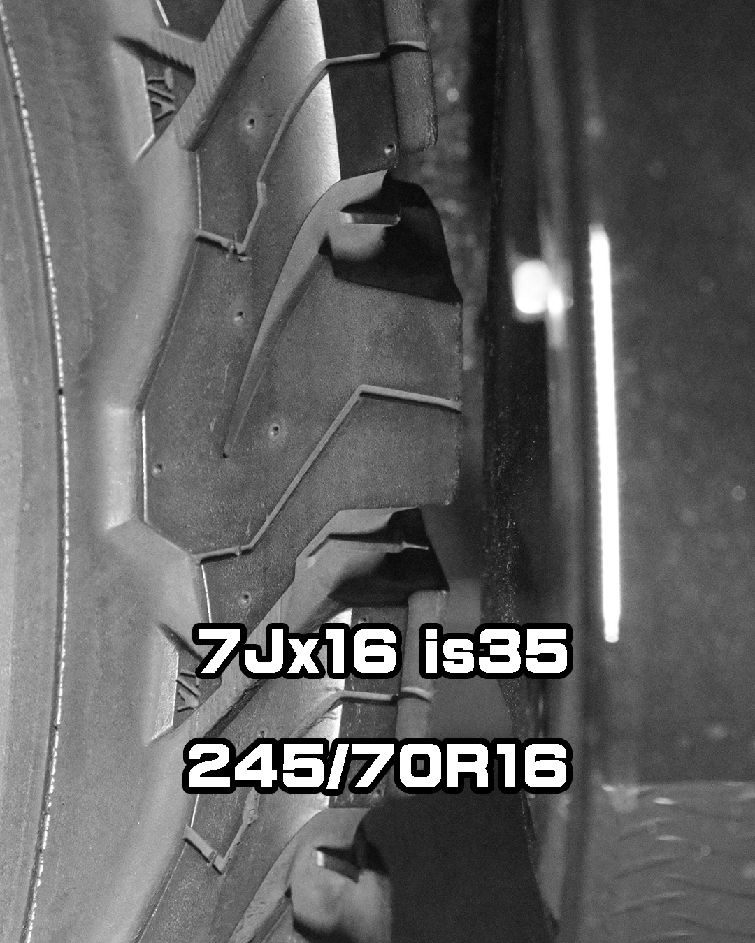 7Jx16 is35 245/70R16 径750mm インナーライナーとのクリアランスは 少しだけあります 7Jx17 is35で 245/65R17の径750mmまでなら同じです |