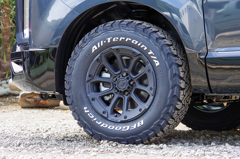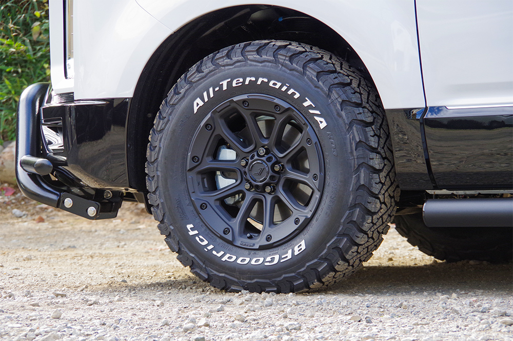三菱デリカD5に16インチ JEPPESEN MJCR216(STEALTH BLACK)を装着です。タイヤはBF Goodrich All-Terrain T/A KO3 LT235/70R16をブラックレターで組込みました。ホイールカラーに合わせてバランスウエイトをブラックにしてナットはMcGardインストレーションKIT BLACKを使って取付けです。出面はリアにGBSデリカD:5専用ハブ一体型スペーサー を入れて迫力ある出面に。黒で統一した足元が締まってオフロード感もある良い感じの見た目と出面に仕上がりました。この度はご来店、ご購入ありがとうございました。ごぶやまパート2